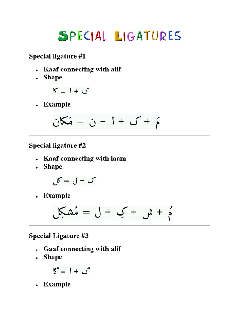 Special Urdu ligatures and their shapes PDF Alphabet Notation